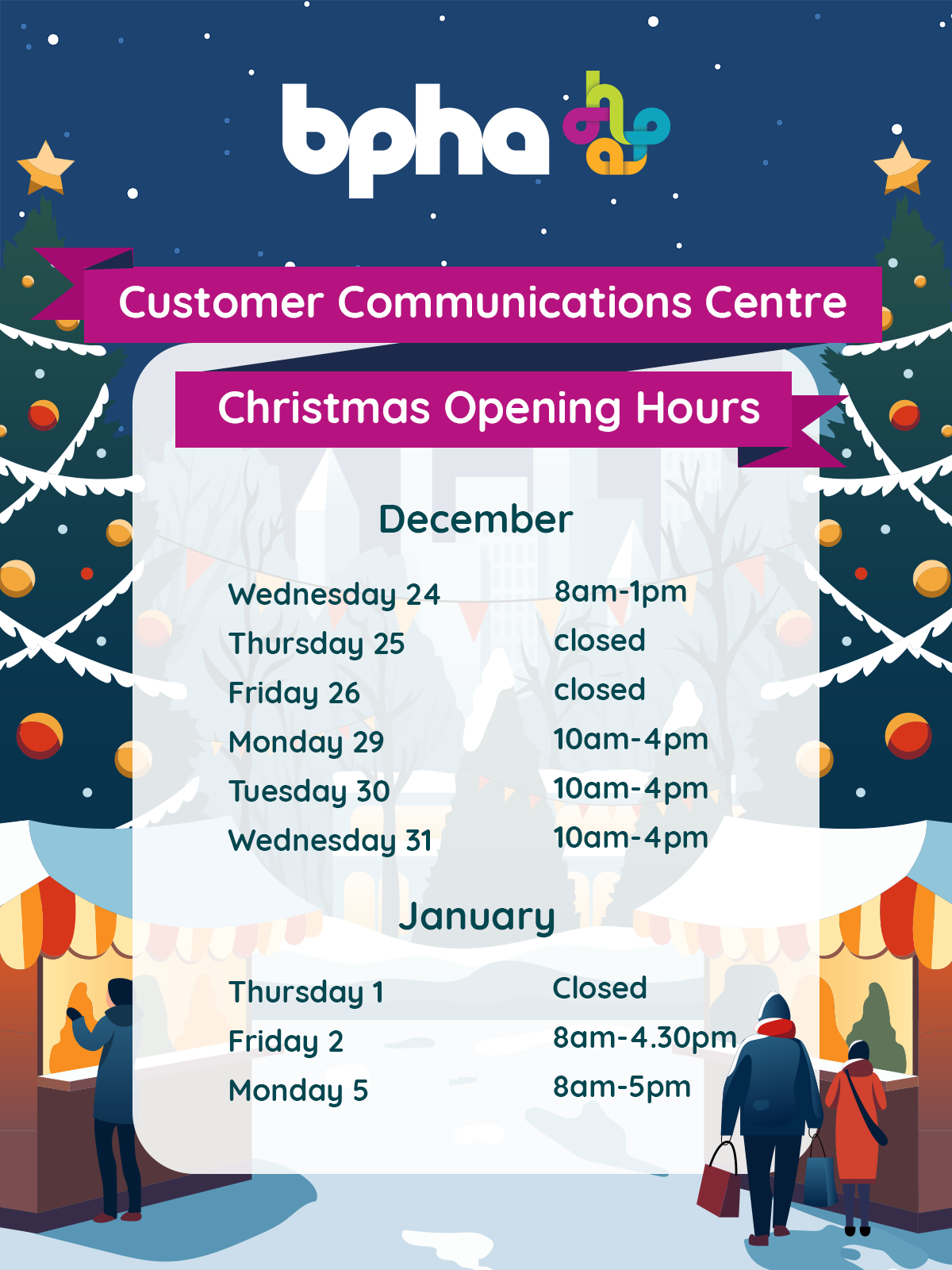 Our office will be closed for the Christmas holidays, but we will have some colleagues from the Customer Communications Centre Team ready to take your urgent calls.