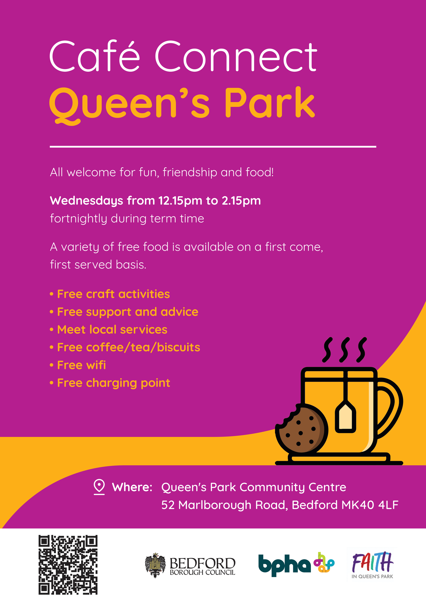 Open every other Wednesday (term time only), 12:15pm to 2:15pm at Queen’s Park Community Centre, 52 Marlborough Road, Bedford, MK40 4LF.